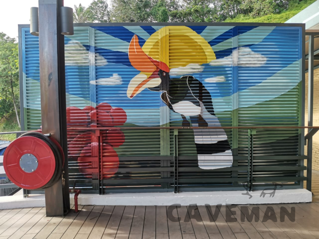 This is our finished works for the large panel. A giant hornbill can be seen picking berries for food above high ground. We selected a bird species due to the campus being next to a forest area that would naturally habitat birds. Red berries are painted to blend with the red fire hose. The column is painted a wooden tree texture to represent a tree figure. A depiction of a hornbill is painted standing on the handrail taking berries. The handrail is also painted with wooden textures to depict it standing on a branch. The effect is more apparent if standing next to the handrail. Even at the bottom, notice how the handrails layer panel is painted to incorporate the hornbill’s tail and the berries. Layers of paint are painted on the background. As you can see, the colours are not able to blend smoothly, and can only be painted as explained above. This is the limitation of stainless steel painting on a stainless steel panel surface using PU Paint.