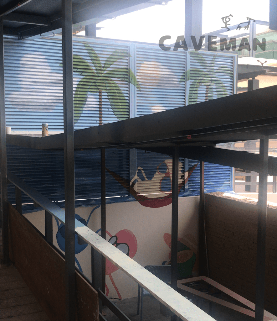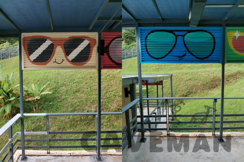 This is the back side of the panel. Thin steel columns are depicted as coconut tree stump and our shades characters are chilling and see as if they are having fun at the beach. Many variations have been made that consisting of painting 2 walls top to bottom side by side. above the roofing, the coconut trees can be seen extended out into the sky. Our design philosophy includes every element and flaw as an opportunity to enhance the artwork.