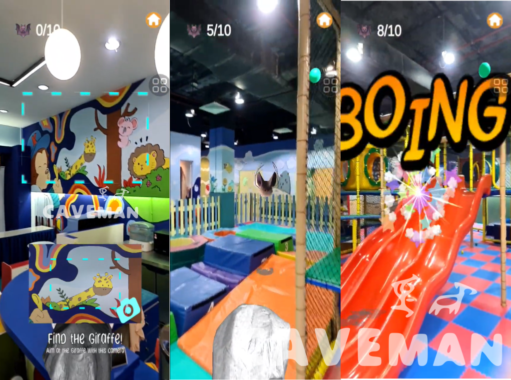 In a past mural AR project for an indoor playground client, we addressed their need to freshen up the business and attract a higher recurring customer rate without the option for physical expansion due to space limitations. Our solution was to not only redesign their murals but also to introduce AR mini-games to diversify their offerings. For example, AR bat shooting mini game as below. To keep the experience fresh and engaging, the game randomly alters the locations of the bats each time it is restarted.