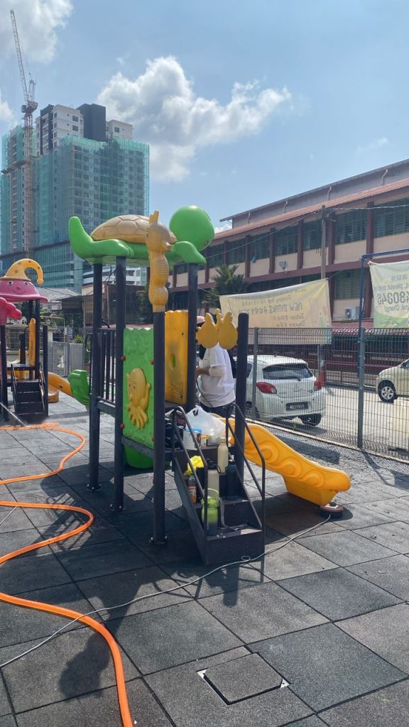 Using a compressor, diluted paint with thinner will be sprayed on all surfaces batch by batch and left under the sun to cure for at least 8 hours. The paint will eventually hardened and create a strong shell layer on the surface of the playground. The playground will be reassembled back to it’s original state the next morning. The total time taken for these 2 playgrounds restoration was 5 days, 10 litres of paint and 15 litres of thinner.